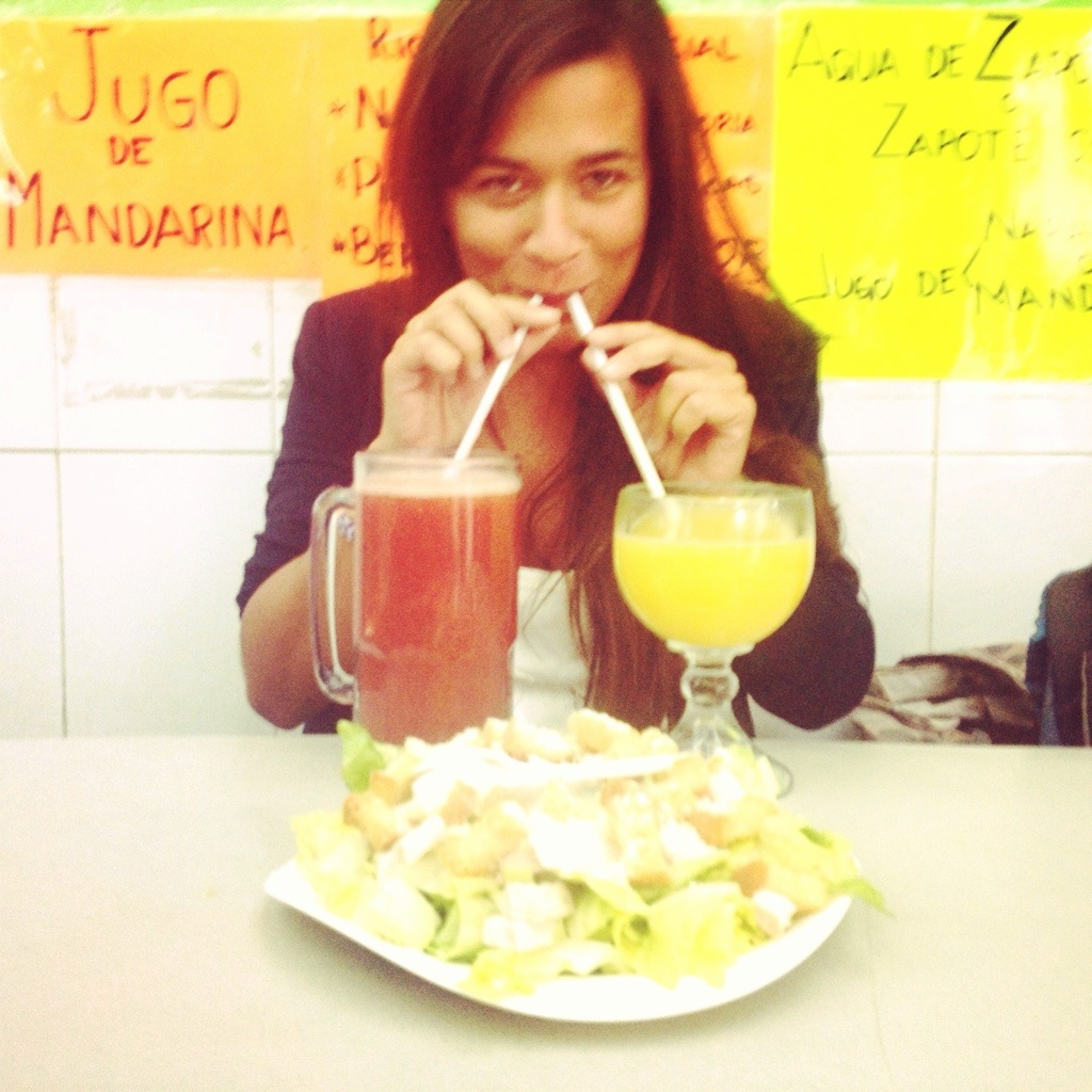 It is a really little place from the early 80’s where hurried businessman and few tourists delight daily the big variety of salads and fresh fruit juices. I ordered a Caesar salad and a giant orange and carrot juice.